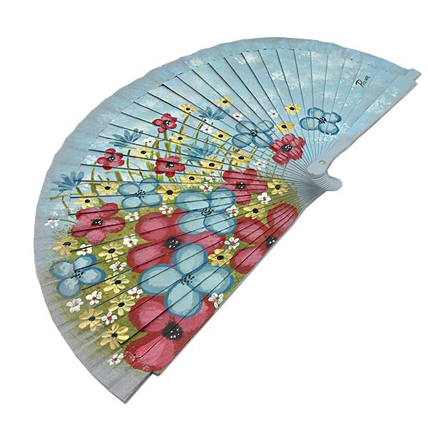 The Fan with flowers presents a soft combination of colors in blue tones contrasting with the bright colors of the flowers that adorn the fan. Each piece is unique, reflecting the mastery and tradition of Spanish artisans.