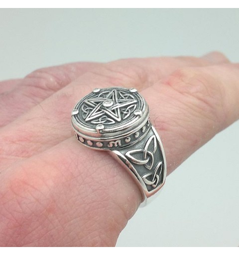 Seal type ring, unisex, adorned with a beautiful tetragramton, knots and Celtic runes. Made of sterling silver and zircons.