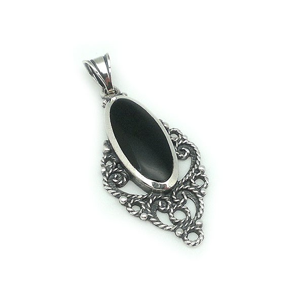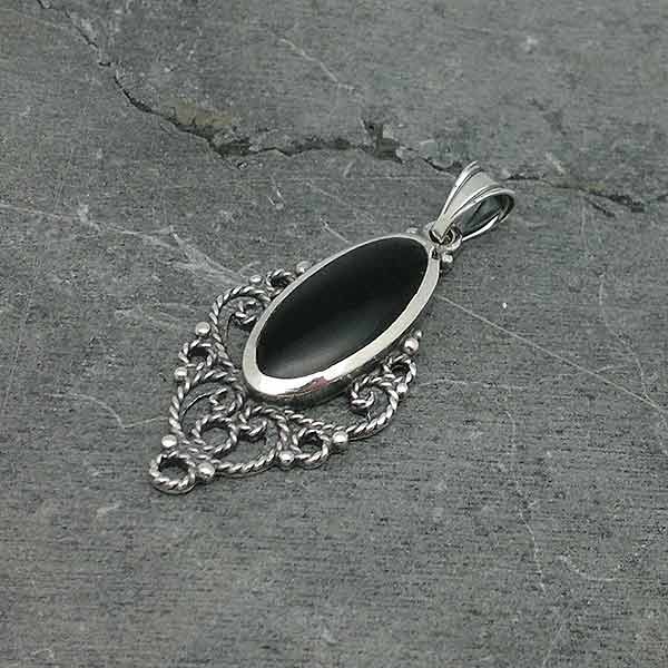 Elegant and original pendant, made in sterling silver and jet, by expert goldsmiths, using very old techniques, such as jet carving and filigree.