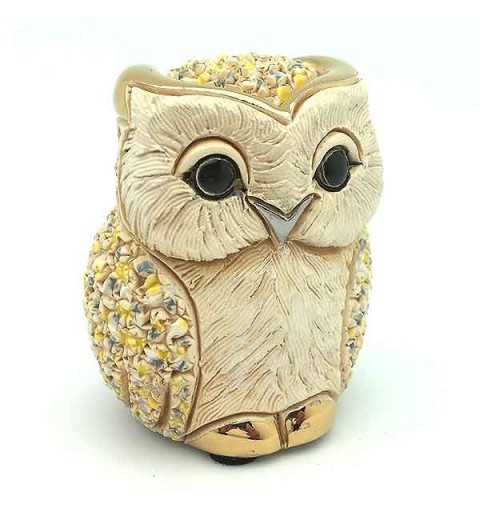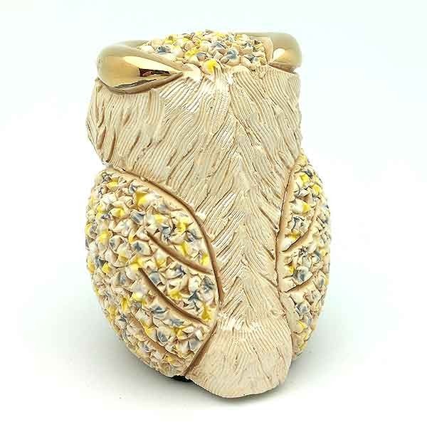Figure of the brand De Rosa Rinconada, representing an owl beige, blue and yellow tones, finished in precious metals such as gold and platinum.
