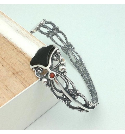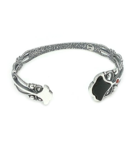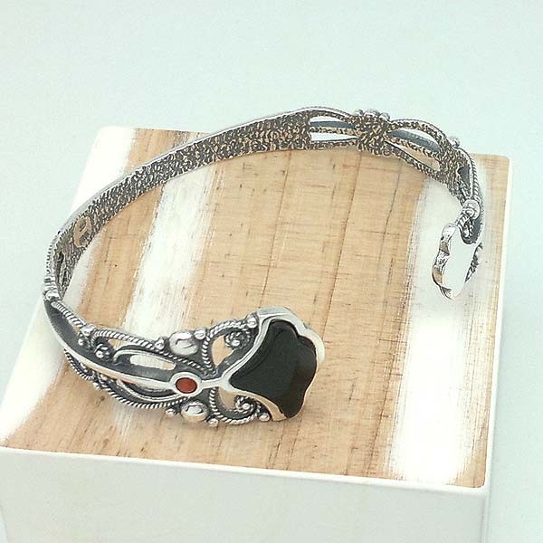 Beautiful bracelet, made of sterling silver, jet and coral, mixing ancient techniques and modern design.