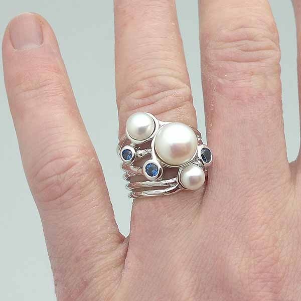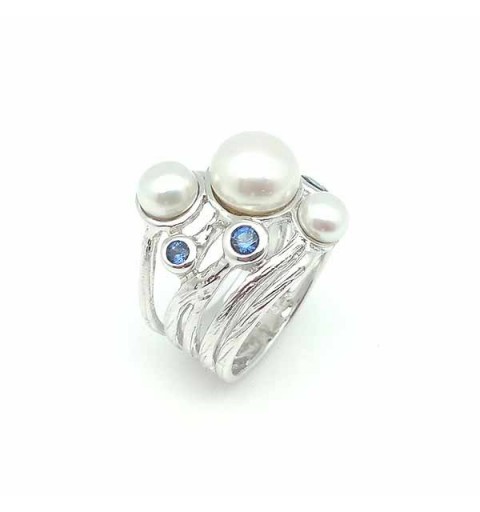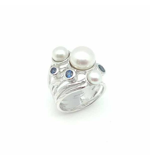 Espectacular anillo elaborado en plata de primera ley, zafiros, aguamarina y perlas.