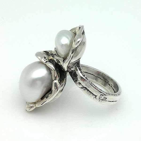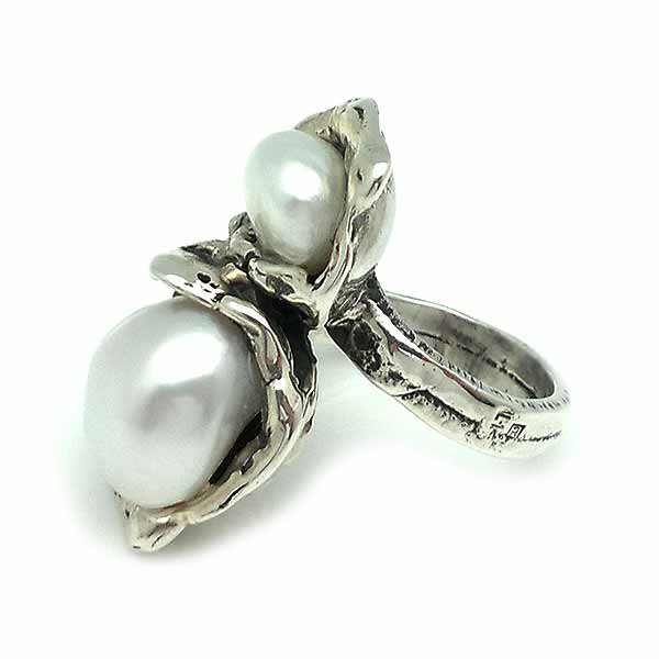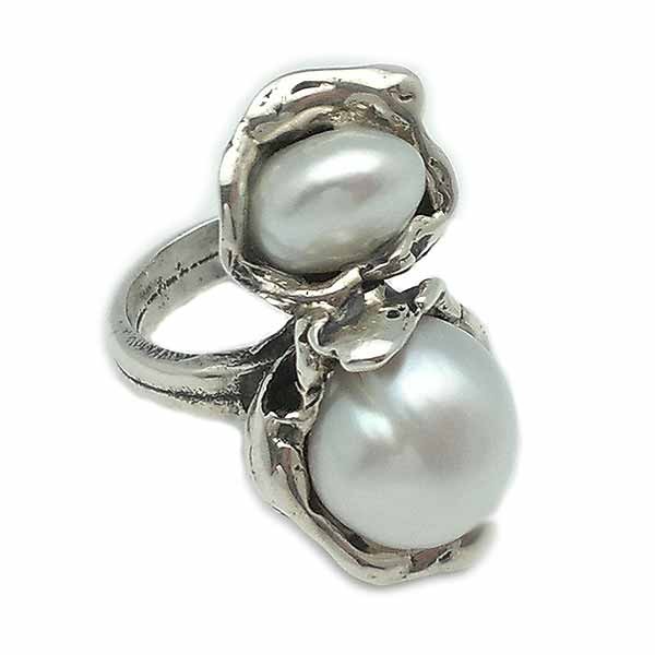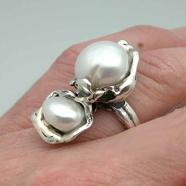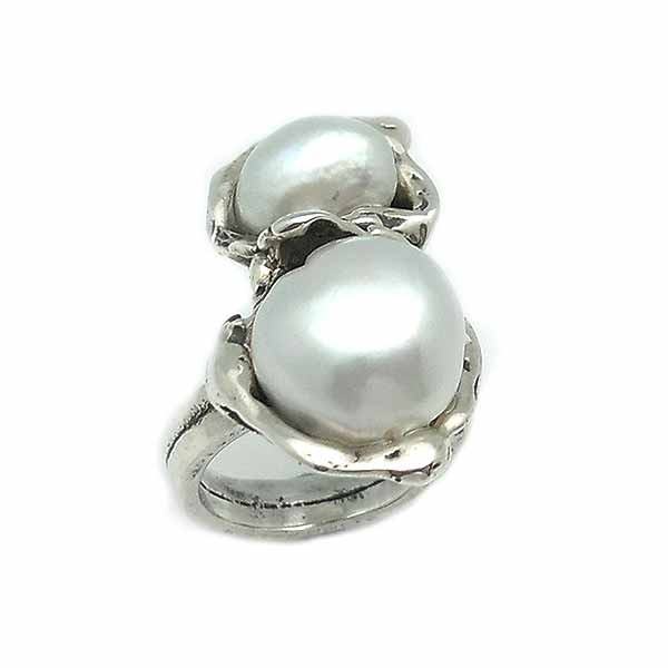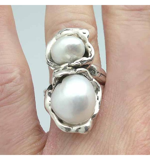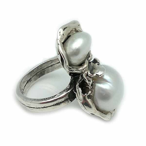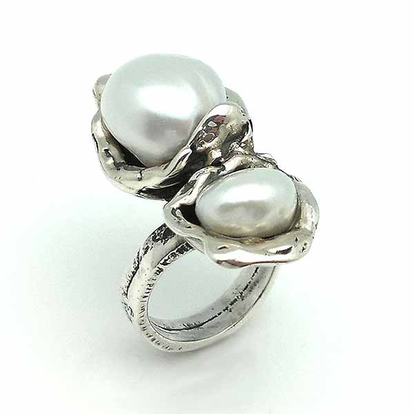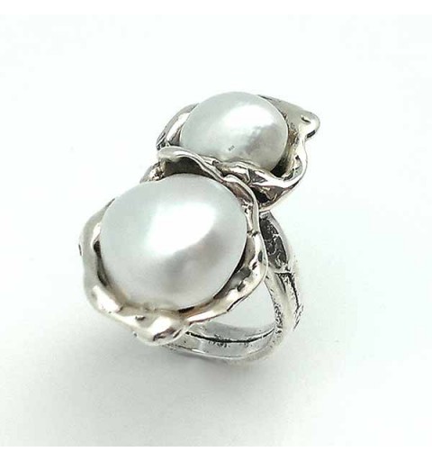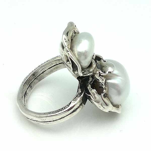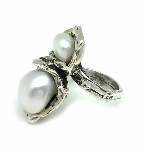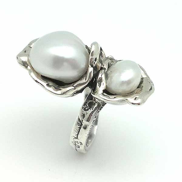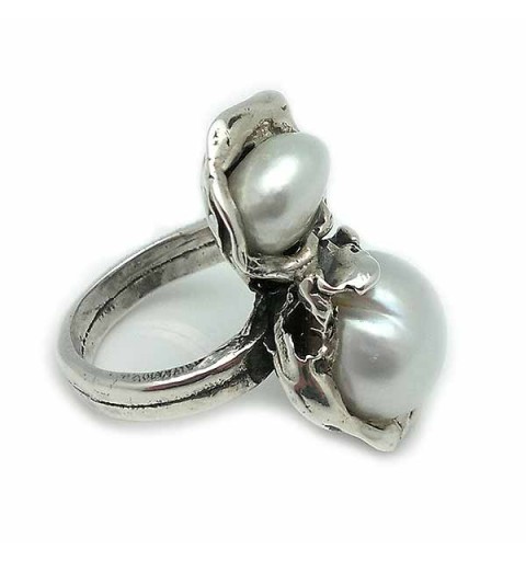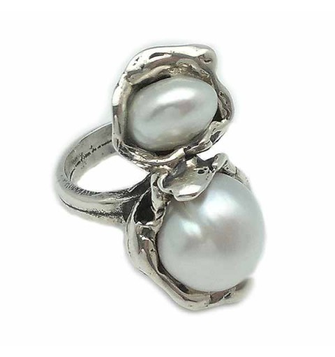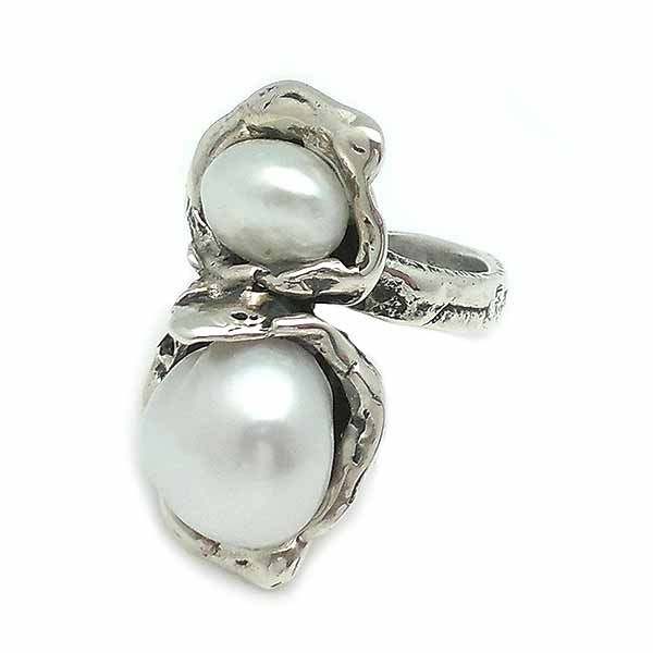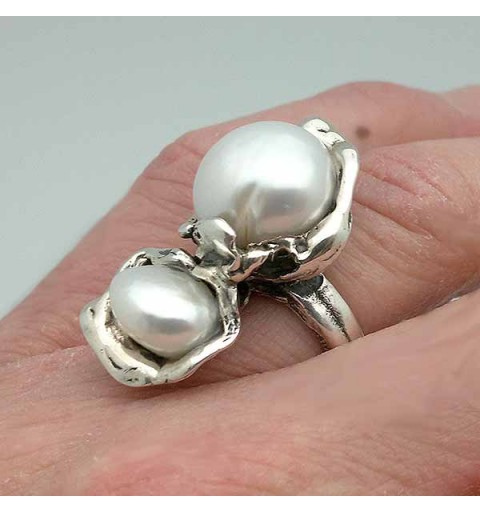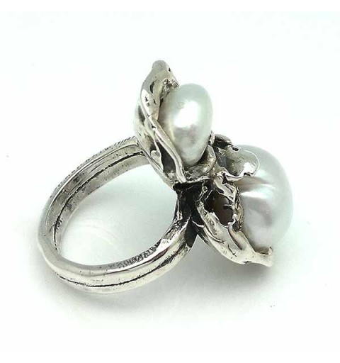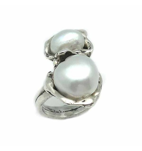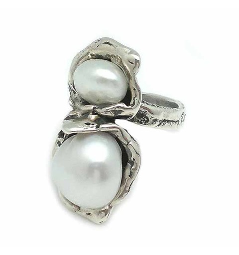 Anillo de estilo barroco, tipo tú y yo, elaborado en plata y perlas naturales.