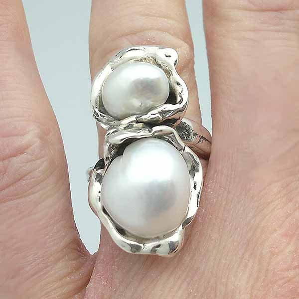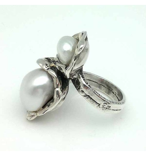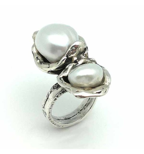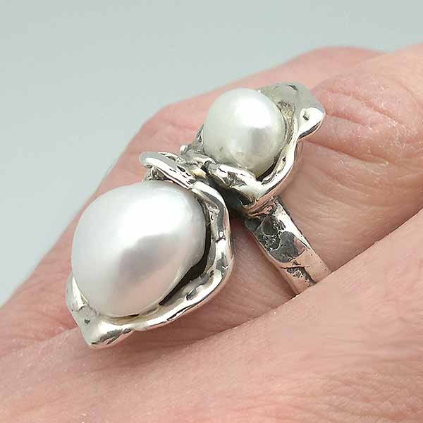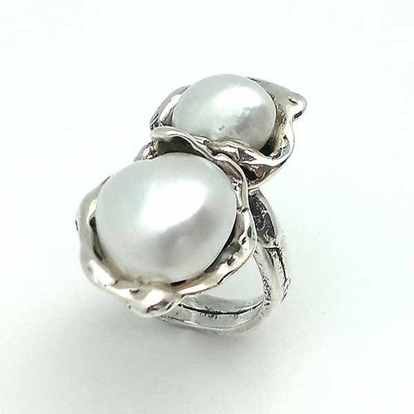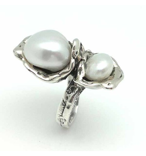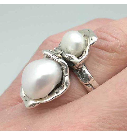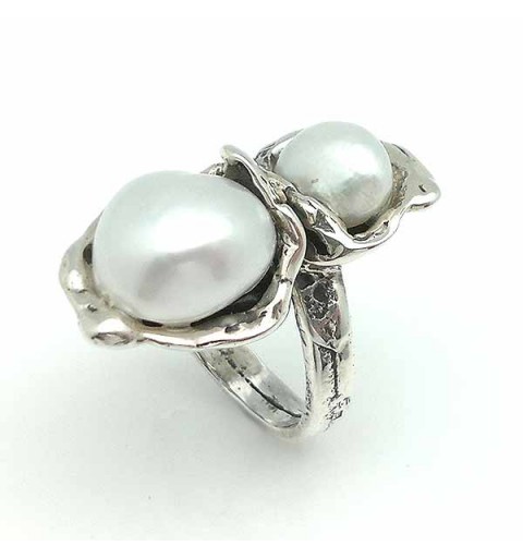 Anillo tipo tú y yo, elaborado en plata de ley y perlas naturales.