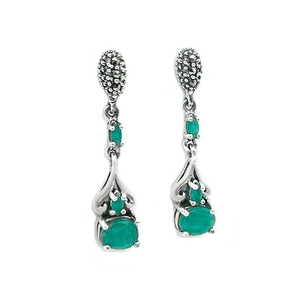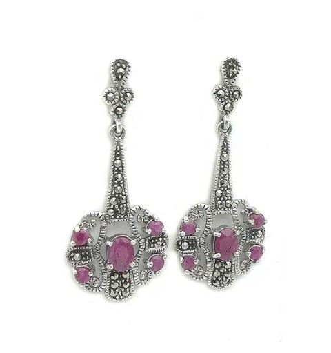 Pendientes en plata vieja, elaborados en plata de ley, rubíes y marcasitas.